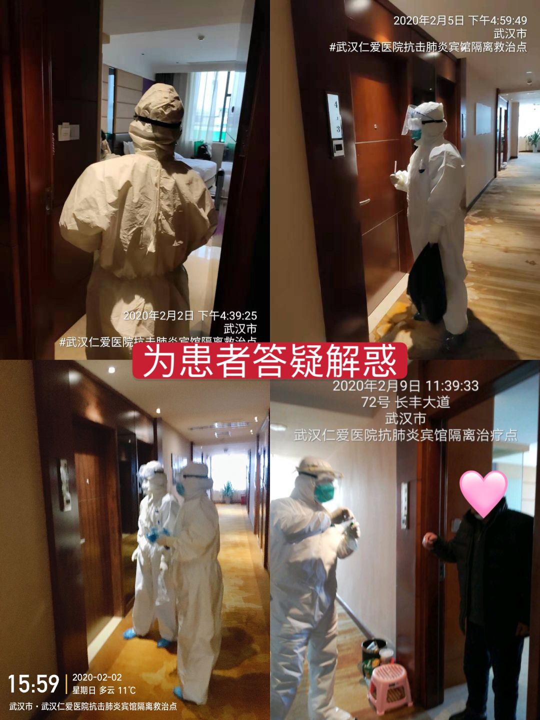 2020年2月1日,在患者病情不熟悉不明确、隔离点内情况相对复杂、医疗防护物资紧缺的情况下,武汉仁爱医院医护团队毅然决然的走进了硚口区第1个“新冠病毒”疑似感染患者隔离点,全面接手医疗照护工作。在近乎没有有效防护的极端条件下,仁爱医院的医护人员没有退缩半步,以信念做支撑,以无畏的行动换来了隔离点的有序运转和患者的安心。而代价就是第一批6人医护团队,在5天后的核酸试剂检测中3人结果呈阳性,高度疑似感染。