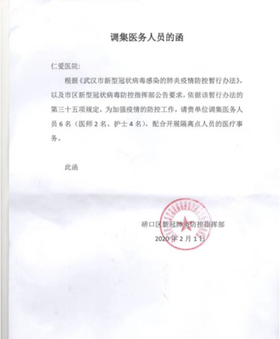 2月8日,武汉仁爱医院在人力、物力资源透支濒临上限的情况下,再次响应硚口区政府号召接管了第2个疑似患者隔离点的医疗照护工作。半个月内武汉仁爱医院集全院力量共接手两处隔离点的工作。疫情就是命令,责任重于泰山,既然穿上白大褂,就要履行一名医务工作者的责任与义务,仁爱医院用实际行动为打赢这场没有硝烟的战争出一份力。